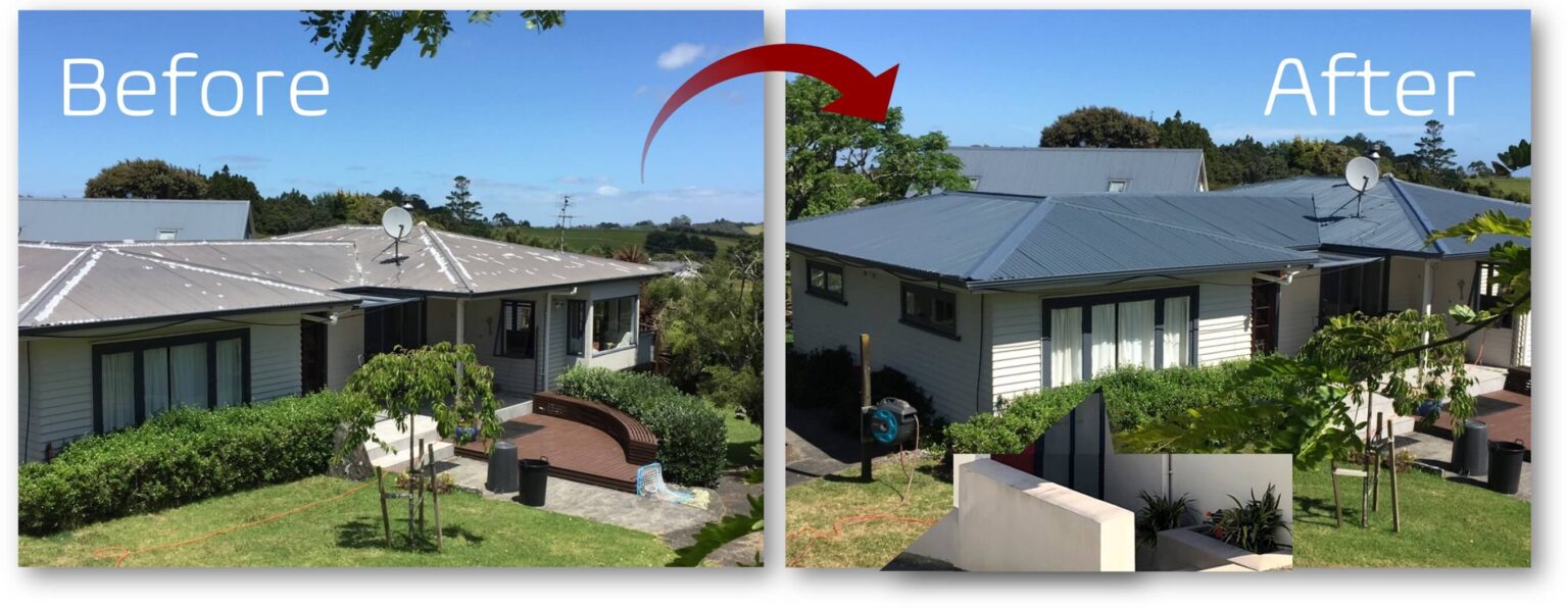 Complete Home Renovation liquid membrane applications start with a chemical clean to kill off moss and mold, then a thorough waterblast to clean the entire surface. From there patching, masking off and drop sheets are used to prepare the surface & a rust buster treatment is applied to stop any further degradation of the roofing material. Two coats of self-priming liquid membrane coatings to follow and complete the coating system. This process typically takes between 2-4 days end to end and is weather dependent.